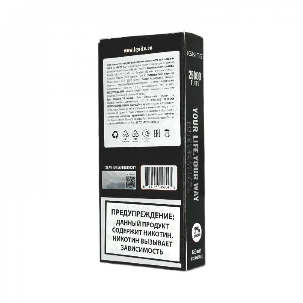 Технические характеристики Электронная сигарета Ignite V250 Black 25000 - Strawberry Kiwi (Клубника киви)